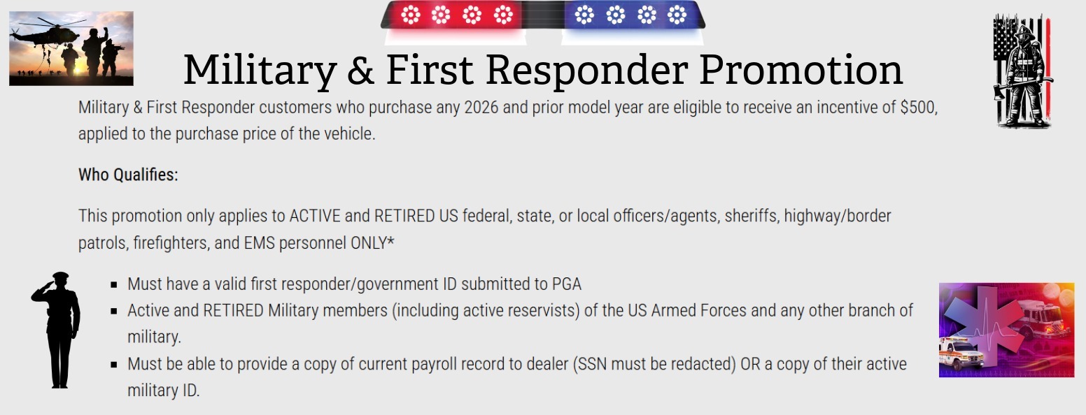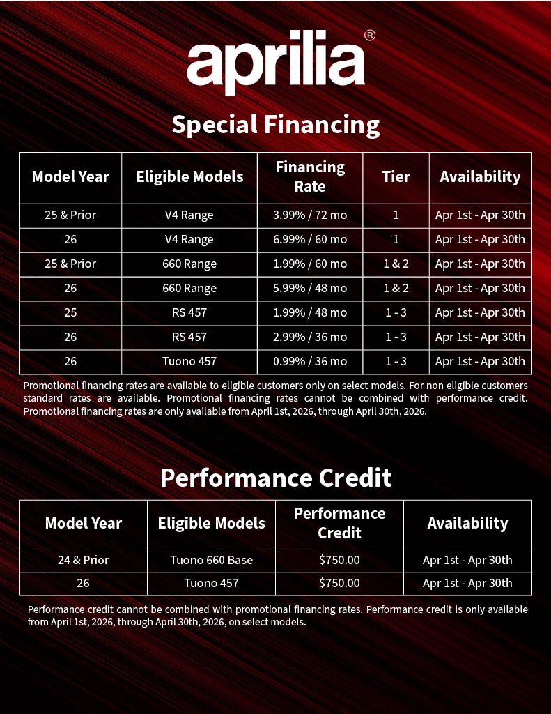 *Military & First Responder customers who purchase any 2026 & prior model year are eligible to receive an incentive of $500, applied to the purchase price of the vehicle. Who Qualifies: This promotion only applies to ACTIVE & RETIRED United States federal, state, or local officers/agents, sheriffs, highway/border patrols, firefighters, and EMS personnel ONLY* - Must have a valid first responder/government ID submitted to PGA - Active Military members (including active reservists) of the US Armed Forces and any other branch of the military. - Must be able to provide a copy of current payroll record to dealer (SSN must be redacted) OR a copy of their active military ID. Disclaimer Info: Piaggio Group Americas is pleased to offer the Military & First Responders Promotion valid from 4/1/2026 through 4/30/2026 to all ACTIVE & RETIRED, United States Armed Forces, Army, Navy, Marine, Air Force, Coast Guard, National Guard, and Reserves as well as Fire, Police & EMS with a valid ID. This promotion ONLY applies to active & retired first responders. Military & First Responders who purchase any 2026 & prior model year Aprilia vehicle are eligible to receive an incentive of up to $500, applied to the MSRP of the new vehicle. The incentive is based on the purchased model cc range as follows: $500 for all Aprilia V4, 660, & 457 motorcycles (scooters not included, track only bikes not included). *Eligible products must be new and unused, for which no retail sales/product registration has been previously submitted or processed.