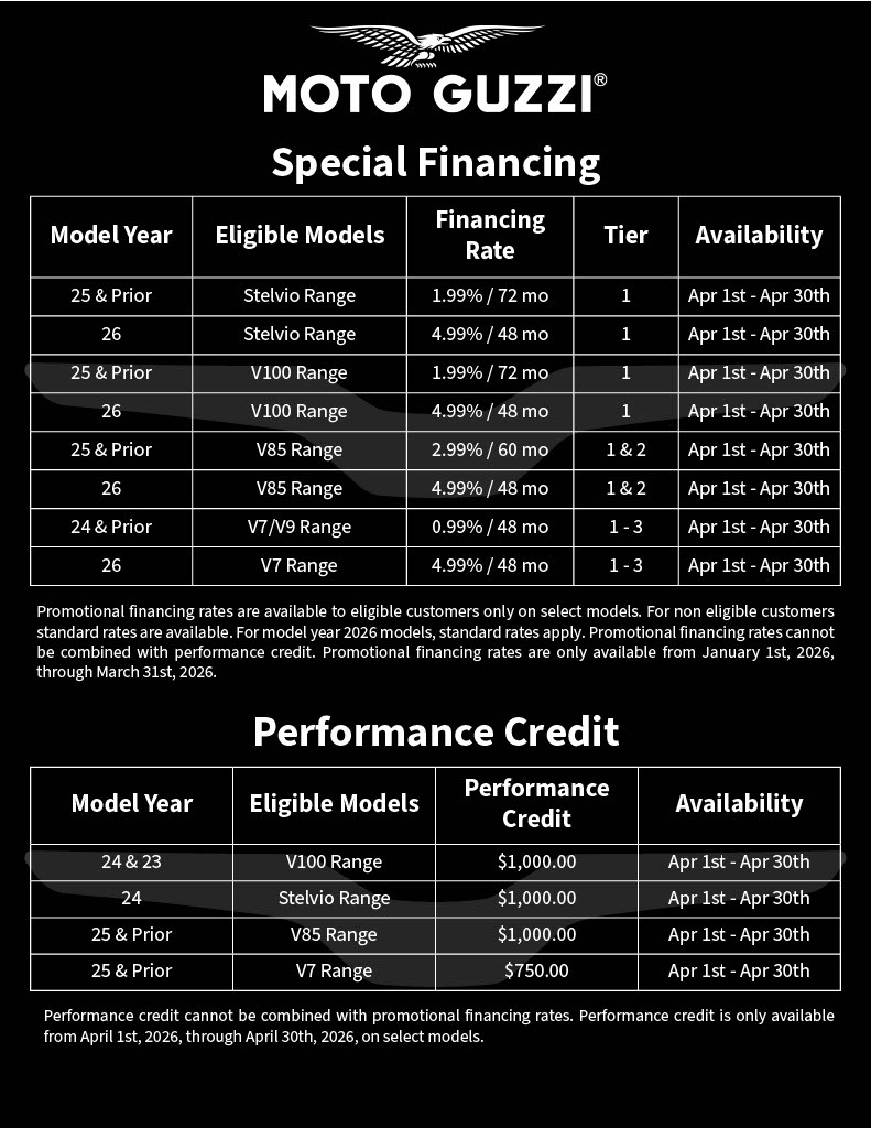 Whether you're drawn to Aprilia's cutting-edge Italian performance or the timeless character and heritage of Moto Guzzi, we're committed to keeping you fully informed. This page is continuously updated by model and model year, so you can shop with confidence knowing you're seeing the most current promotions available.